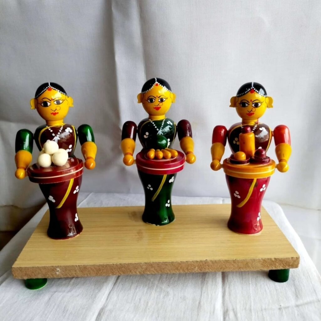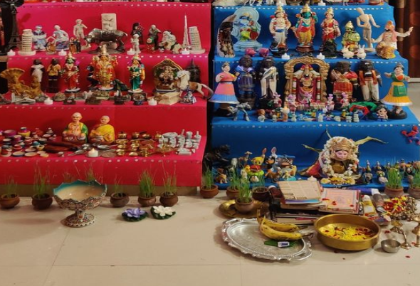It is a traditional and artistic display of dolls by women in Hindu homes and temples. It is a tradition for girls, unmarried and married Hindu women. The dolls (also known as bommai/bommalu/bomme) are displayed on a series of an odd number of wooden steps/racks/planks.